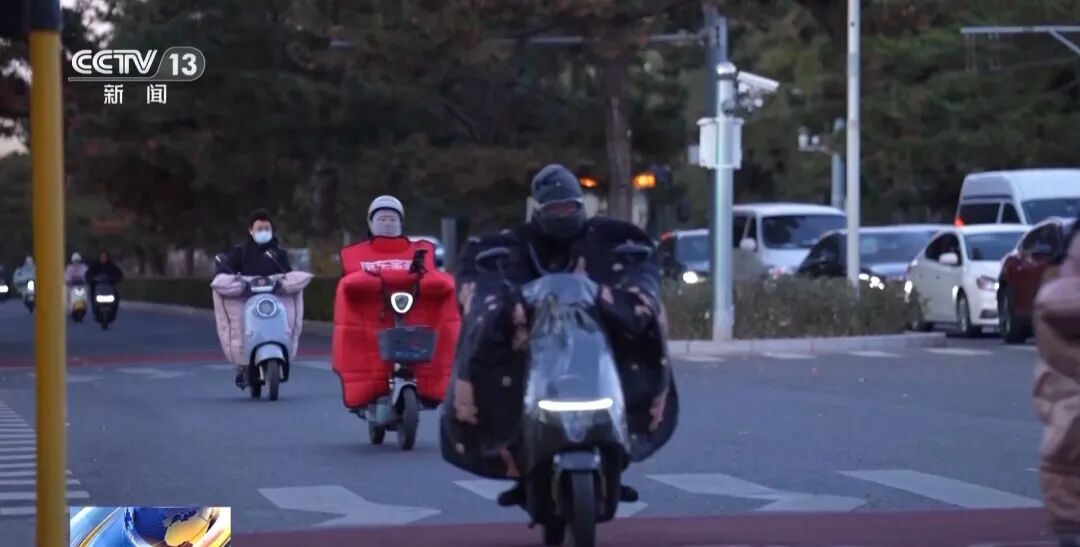 随着气温下降,电动车骑手们的防寒装备花样百出。有的女士围巾飘曳,有的男士反穿外套,最常见的当属连体挡风被,因厚实保暖成了很多人的“标配”。