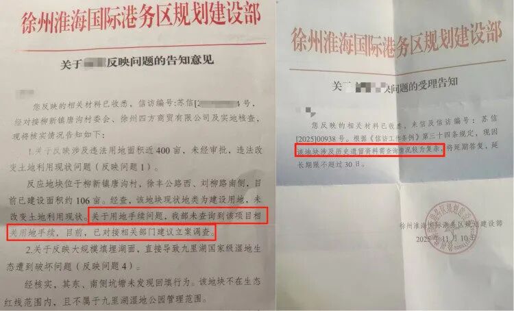 针对村民提出的项目手续是否齐全及是否破坏九里湖湿地保护区的问题,2025年10月14日徐州淮海国际港务区规划建设部给村民的“告知意见”显示,反映地块位于柳新镇唐沟村,徐丰公路西、刘柳路南侧,已建设面积约106亩。经查,该地块现状为建设用地,未改变土地利用现状,但未查询到相关用地手续,已对接部门建议立案调查。同时,“告知意见”提到未发现东、南两侧坑塘回填行为,且地块不在九里湖生态红线范围内。