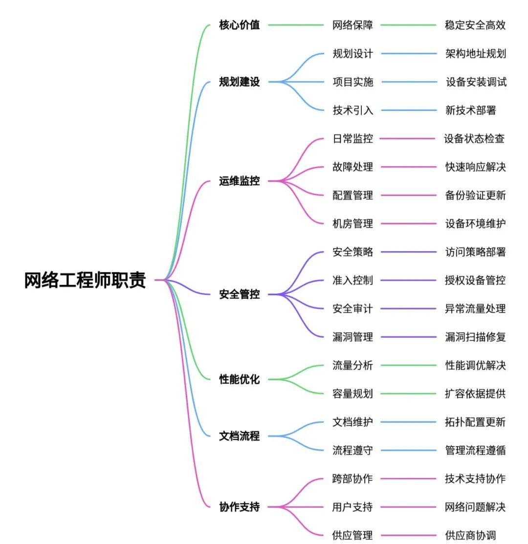 这些职责可作为招聘、考核与培训的基准,核心是构建高可用、高安全的网络环境,支撑企业数字化业务顺畅运行。