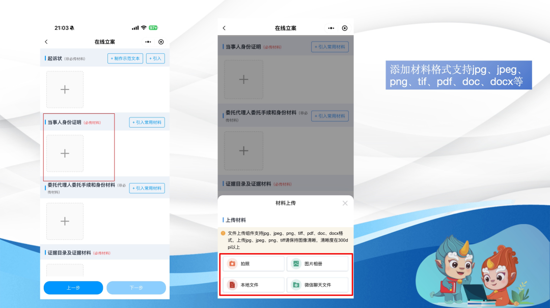 a) 点击“已准备诉状”选项。然后点击页面上的“加号”按钮,您可以自由选择材料上传方式,支持拍照上传、从图片相册选取、从微信聊天记录读取文件等四种途径。