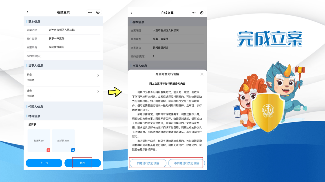 c) 确认无误后点击提交,系统会询问是否同意先行调解,您根据个人意愿选择后,就完成整个网上立案流程了。