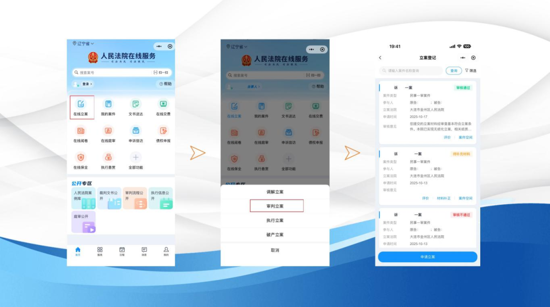 a) 如果您是通过网上提交的立案申请,后续想了解案件进展,可以点击小程序首页的“在线立案”,选择“审判立案”,找到对应的案件后点击“案件空间”,就能查看立案的最新进度了。