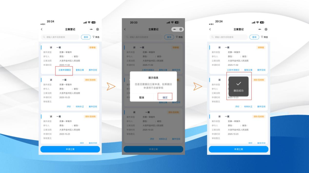 c) 若双方私下和解,或者发现立案材料有误需要重新准备,您可以找到该案件,点击“立案申请撤回”并确认,就能撤回此次立案申请了。