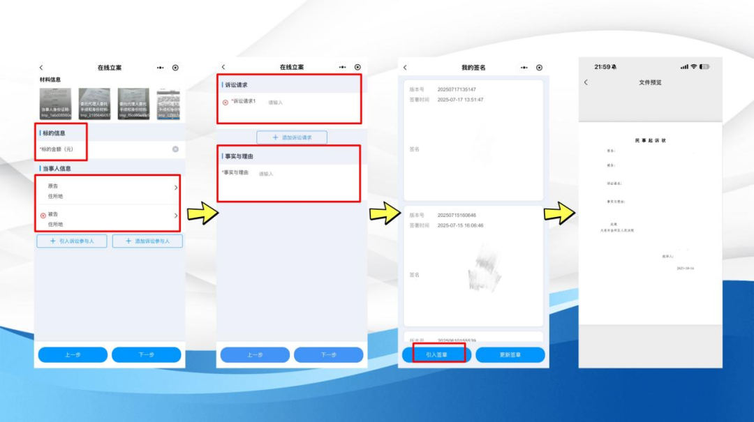 b) 上传完当事人身份信息、证据材料及证据目录、送达地址确认书等必传材料后,点击“下一步”。接下来需要填写案件标的金额、补全当事人身份信息、输入诉讼请求以及案件的事实与理由,再点击“引入签章”,这样起诉状就制作完成了,您还可以点击预览查看内容。