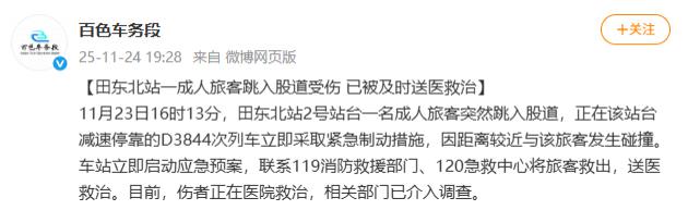 11月24日晚间,中国铁路南宁局集团有限公司百色车务段通过官方微博发布了一则关于旅客跳入股道与动车碰撞事件的通报。