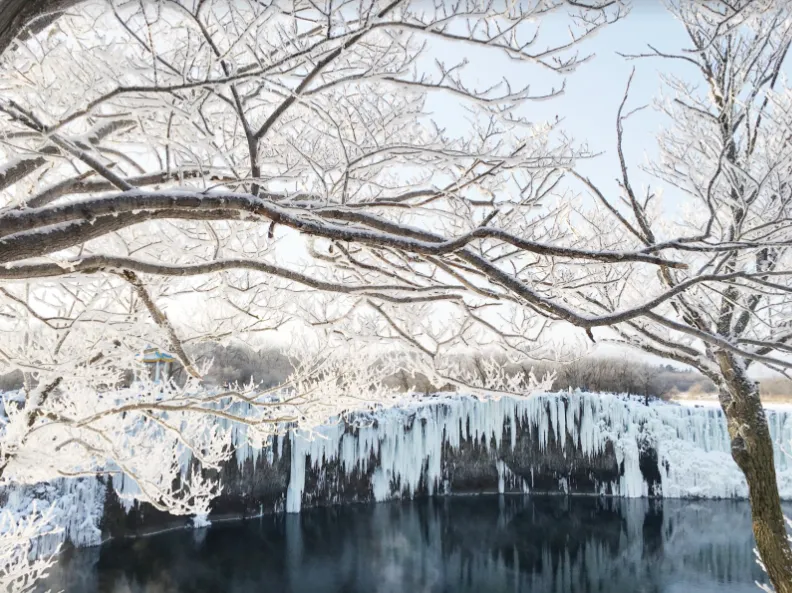 这里的雾凇堪称“长寿选手”,每年持续近四个月,每日“在线”超十小时。发电站的温水与冷空气相遇,河面雾气蒸腾,凝结成沿河连绵的玉树琼枝。漫步其间,仿佛置身“寒江晓雾,凇花漫天”的水墨长卷,随手一拍都是童话雪国大片。