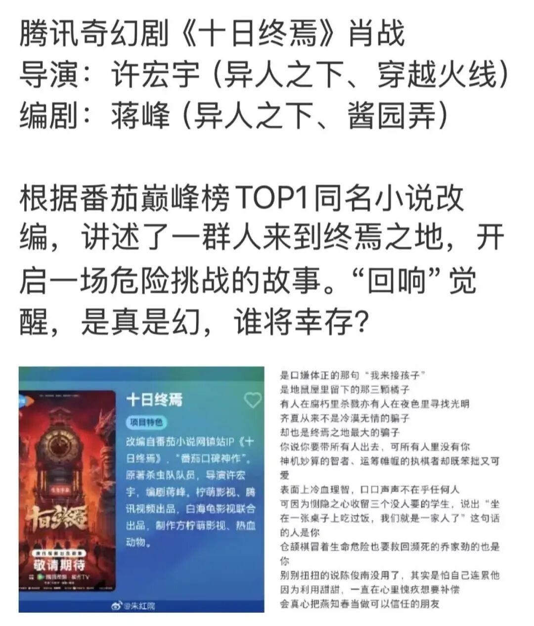 目前已确定执导《十日终焉》和监制《明日乐园》的许宏宇,在《穿越火线》《异人之下》等作品中展现出将虚拟竞技热血感视觉化的能力,确实适合驾驭需高概念和强节奏的无限流作品。