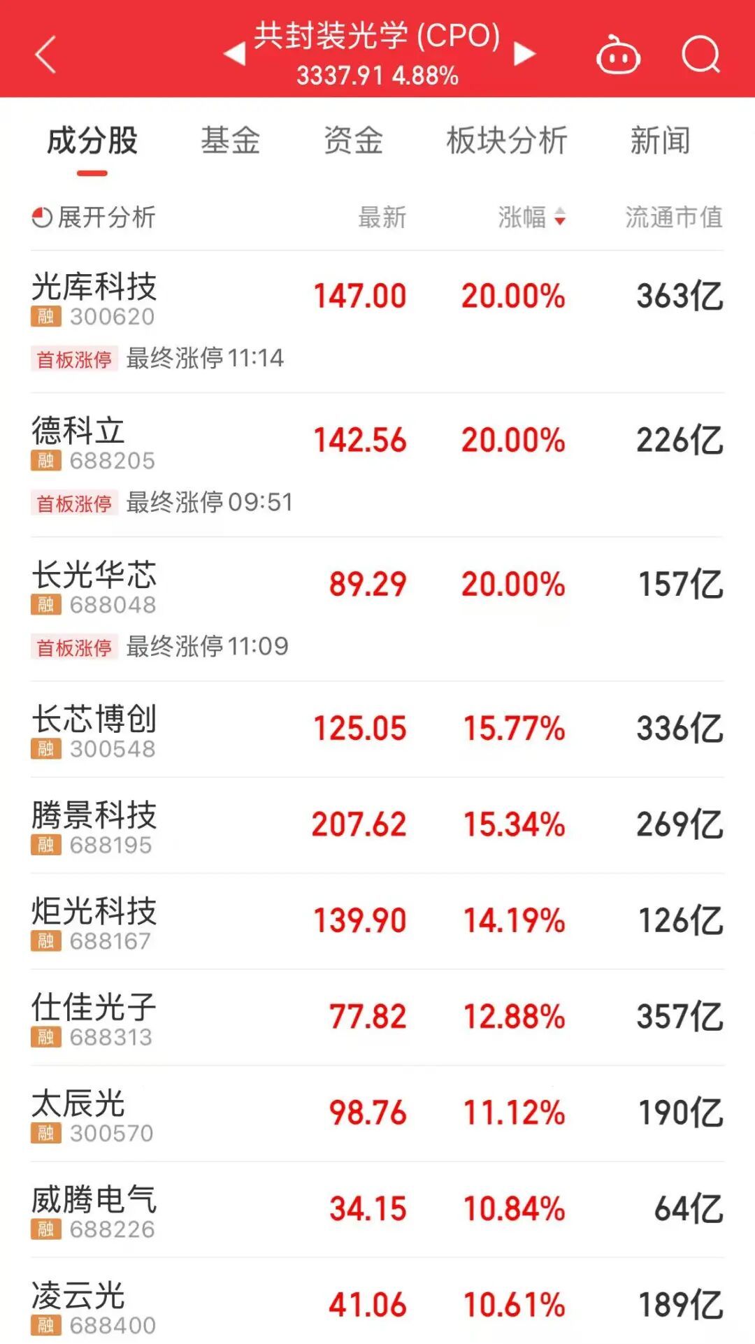 特别值得关注的是,谷歌概念股成为早盘AI主线行情的核心推动力,板块内个股全面走强。光库科技、德科立实现“20CM”涨停,腾景科技、长芯博创涨幅均超15%,胜宏科技、赛微电子等个股也纷纷大幅上涨。