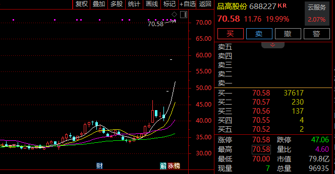 芯片股早盘表现活跃,板块指数高开高走,涨幅接近3%。品高股份连续第三个交易日开盘即20%涨停,股价刷新历史新高;德科立、光库科技、长光华芯、佳缘科技等个股也纷纷以“20cm”涨停板报收;长芯博创、力芯微、灿芯股份、瑞斯康达等逾30只个股涨幅超10%或强势涨停。