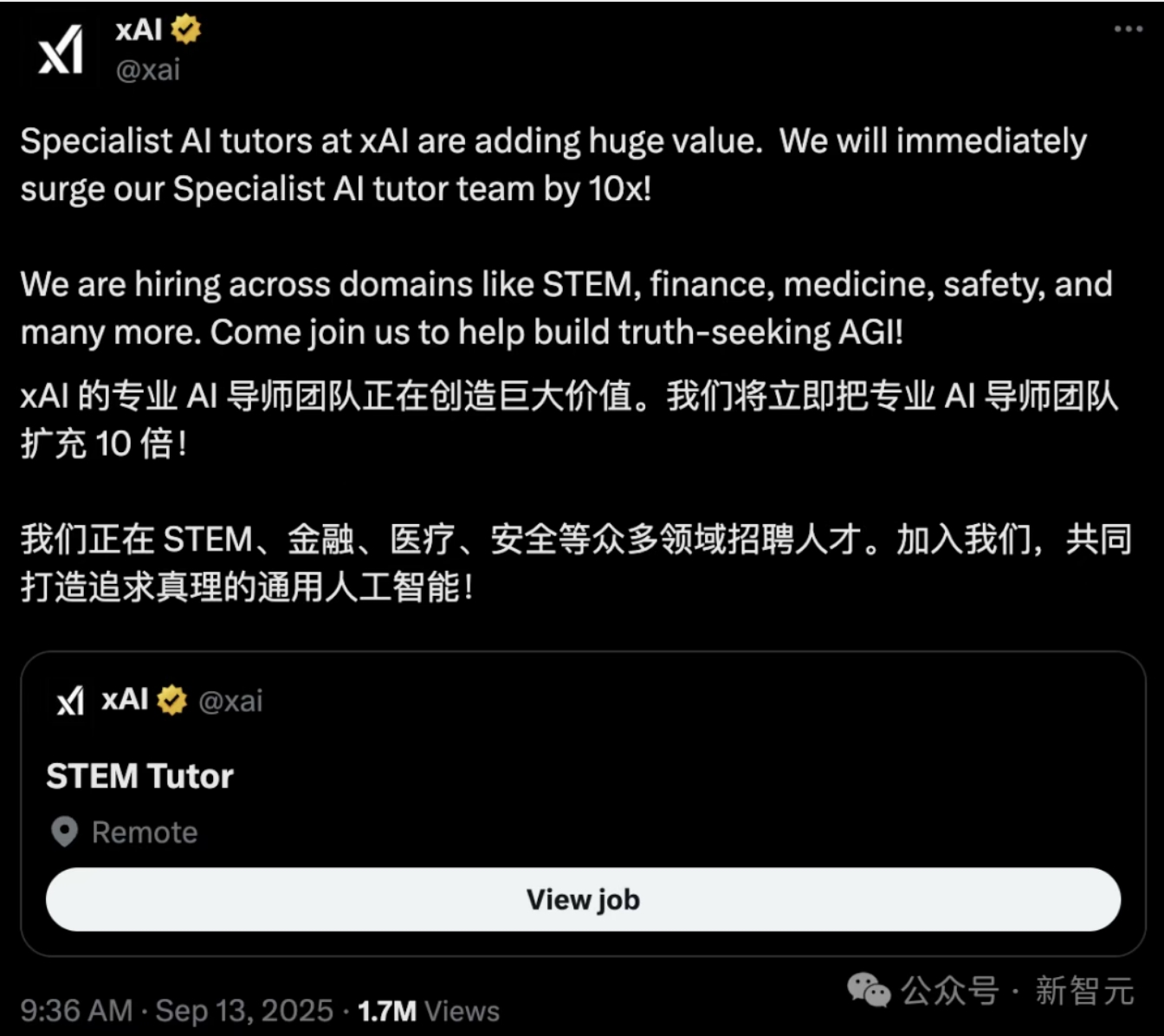 9月,xAI宣布立即把专业AI导师团队扩充10倍规模,涵盖STEM、金融、医疗、安全等众多领域。