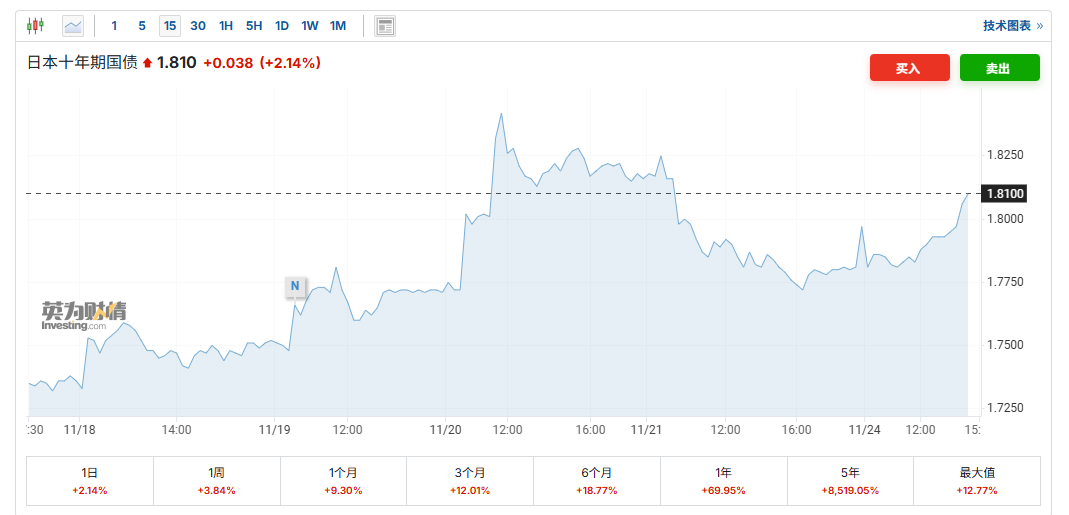 美股的强劲表现并未让日本股市实现明显修复。11月25日,日经225指数早盘曾反弹超1%,但午后突然跳水,走势震荡。与此同时,日本十年期国债收益率再度攀升至1.8%以上。