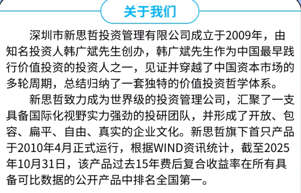 新思哲是一家成立于2009年的深圳老牌私募。其创始人韩广斌是中国较早践行价值投资的人士之一,1993年便投身证券投资研究领域,亲身经历并成功跨越中国资本市场的多轮牛熊周期。二十多年来,他总结出了一套独特的新思哲价值投资哲学体系。