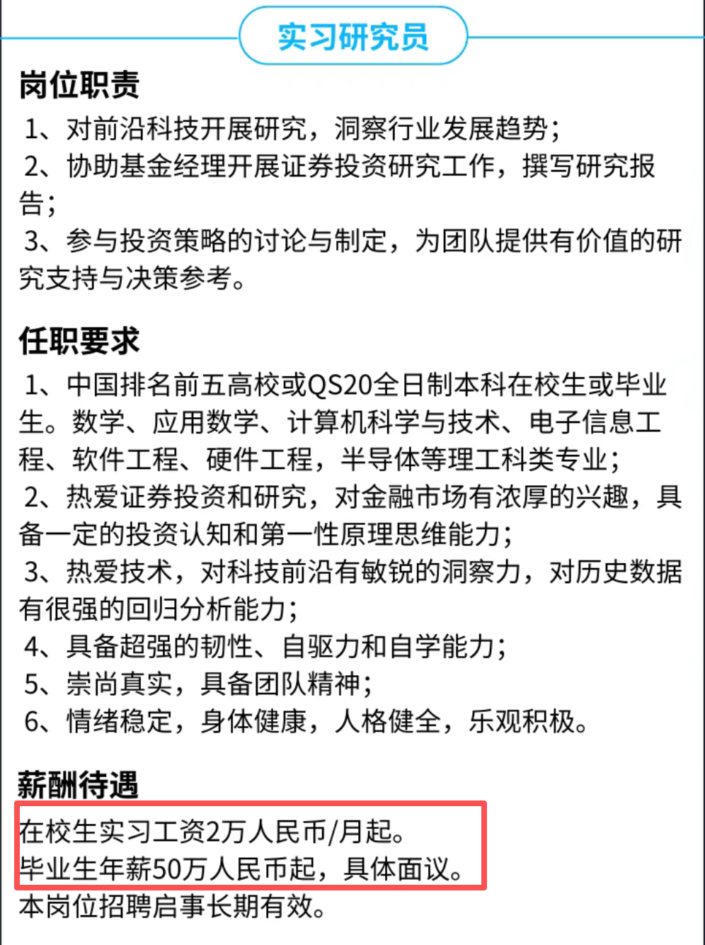 新思哲的招聘要求也充分体现了这一点:实习研究员需是中国前五高校或QS前20的全日制学生,专业为数学、计算机科学与技术、电子信息工程、半导体等硬核理工科;不仅要对金融市场有浓厚兴趣,还要具备第一性原理思维,能敏锐洞察科技前沿,甚至拥有出色的历史数据回归分析能力。简单来说,他们需要的不是“打杂跑腿”的实习生,而是能快速协助基金经理做研究、写报告,甚至参与投资策略讨论的“准专业人员”。