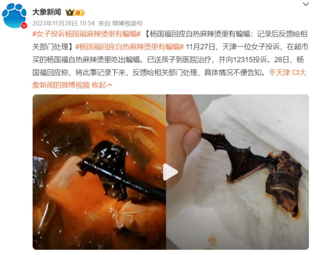 2023年11月,天津一女子投诉,她在超市买的杨国福自热麻辣烫里吃出了蝙蝠。杨国福集团对此回应称,将此事记录下来,反馈给相关部门处理,具体情况不便告知。