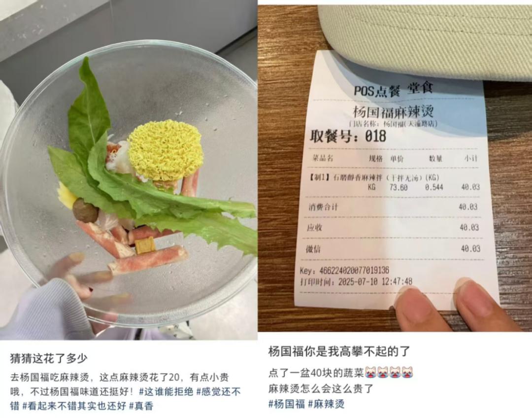 有网友晒出点餐单据,显示一份干拌麻辣烫实付金额达40.03元,并配文称“杨国福你是我高攀不起的了”,表示“点了一盆40块的蔬菜”。