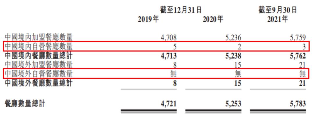 根据2021年的公开招股书数据,截至当年9月30日,杨国福集团旗下全球餐厅共计5783家,包括位于上海的3家自营餐厅,5759家在中国大陆的加盟餐厅,以及布局在澳大利亚、加拿大、韩国、美国、日本和新加坡的21家海外加盟餐厅,加盟店占比高达99.9%,是其业绩的绝对支柱。