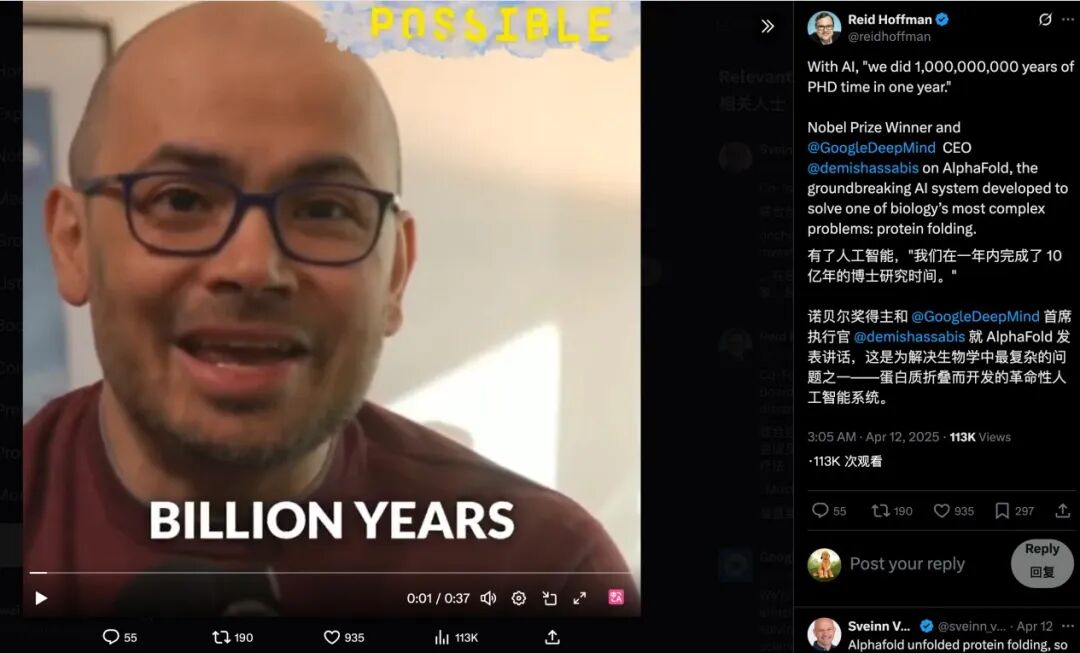 2024年,因为蛋白质结构预测,谷歌DeepMind CEO 德米斯·哈萨比斯(Demis Hassabis)获得诺贝尔化学奖。最近,他又曝出了一段惊人言论:“通过AI,我们在一年内完成了10亿年的博士研究时间。”