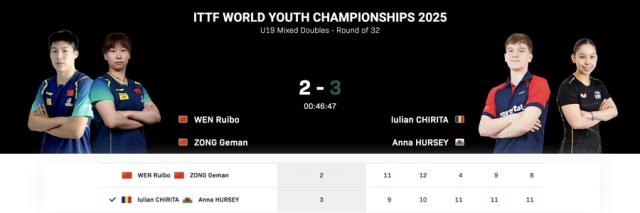 在罗马尼亚克卢日-纳波卡举办的2025年国际乒联世界青少年乒乓球锦标赛上,又一场冷门赛事引发关注。11月25日的U19混双十六分之一决赛中,中国组合温瑞博/纵歌曼在率先拿下两局的有利形势下未能把握机会,最终以11比9、12比10、4比11、9比11、8比11的比分,被罗马尼亚与威尔士的跨国组合尤利安·基里塔/安娜·赫尔希逆转,无缘十六强席位。