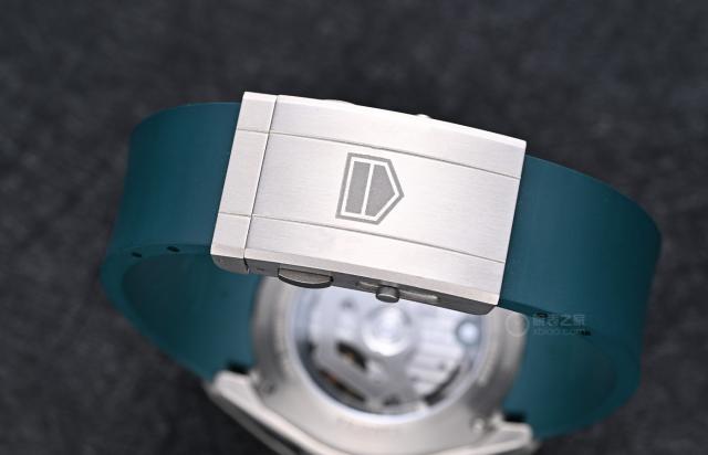 腕表配备一条青绿色一体式橡胶表带,搭配钛金属折叠扣。表带上的绿色与表圈、表盘的绿色元素和谐统一。
