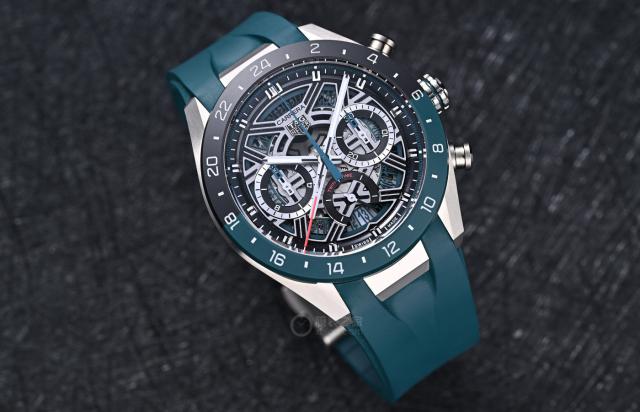 镀铑镂空表盘融合了多种设计元素,镂空框架线条张弛有度。Extreme Sport系列通常会加入鲜明色彩,让腕表视觉效果更丰富,这款新作以青绿色为主色调,点缀在计时指针、盘面外缘等处,透过镂空盘面还能清晰看到下方环绕的青绿色日历环,结合6点位开放式日期视窗呈现。泰格豪雅用色彩保证了卡莱拉系列注重的“清晰、高效”读时性能。