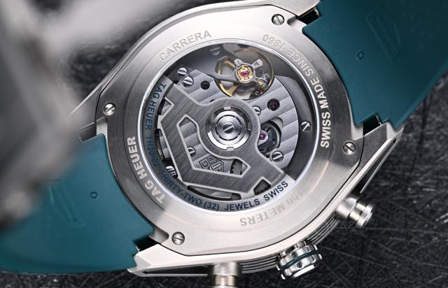 机芯方面,腕表搭载TH20-02机芯,由泰格豪雅经典TH20机芯添加两地时模块而成。计时结构依旧采用垂直离合搭配导柱轮,延续了TH20机芯的出色性能,满链可提供80小时动力储备。