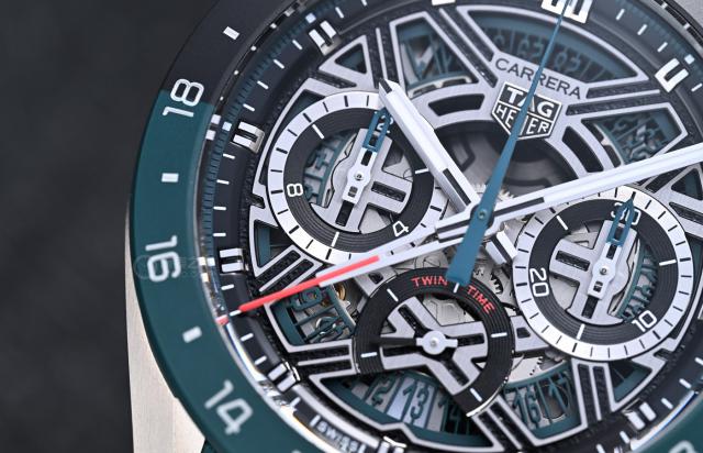 腕表采用三眼计时盘设计,3点钟位置是分钟计时盘,6点钟是小秒针盘,9点钟是小时计时盘,中置一根绿色计时秒针。泰格豪雅的镂空表盘通过不同水平线的结构增强了层次感,还融入大量赛车元素,让表盘呈现出类似赛车发动机的机械美感。