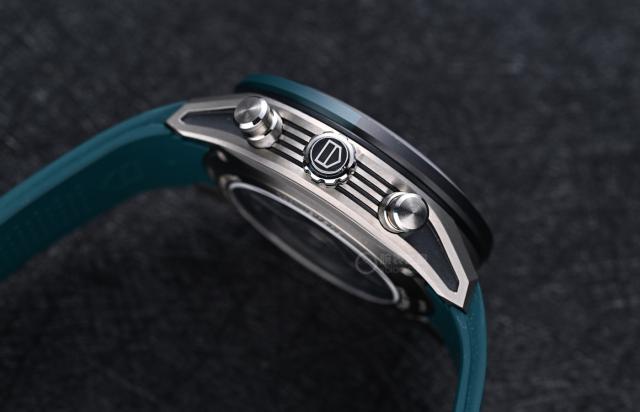 表冠顶部印有泰格豪雅经典LOGO,两个泵式计时按钮按压手感清晰,按钮细节处采用环形拉丝搭配边缘斜角抛光,质感十足。整表防水深度达100米,满足日常佩戴需求。