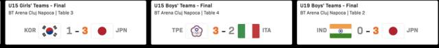 本届世青赛团体赛场,日本队是最大赢家:拿下女子U15、男子U19两项冠军,U19女团获亚军;国乒战绩单薄,仅获女子U19冠军,其余三项团体赛中,男子U15与女子U15止步四强,男子U19止步八强。