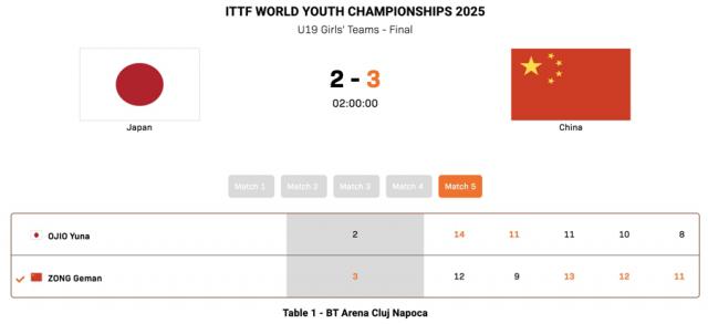 首盘纵歌曼2比3不敌青木咲智,国乒先丢一分;覃予萱第二盘3比0轻取小盐悠菜扳平;第三盘姚睿轩3比0胜高森爱央,中国队首次领先。但第四盘覃予萱0比3不敌青木咲智,双方重回同一起跑线。决胜盘纵歌曼在0比2落后时连扳三局险胜小盐悠菜,拼下金牌。