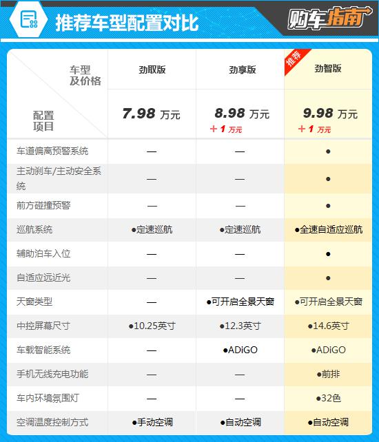 通过对比配置可以发现,劲享版与入门的劲取版相比,虽增加了可开启全景天窗、ADiGO车载智能系统以及自动空调等日常使用率较高的配置,但与当前主流配置仍有差距。而推荐的车型则新增了诸多实用性配置以及主动安全和辅助驾驶功能,智能化水平进一步提升,能够切实改善日常用车体验,建议选择升级版本。