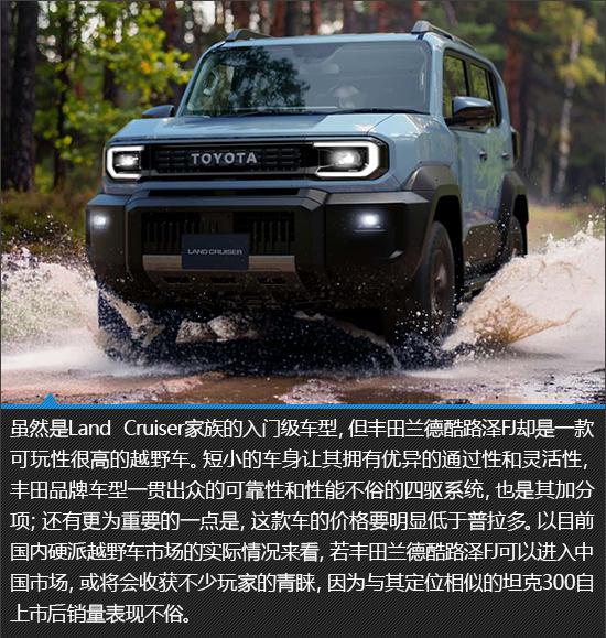 丰田打造的这款价格亲民、尺寸适中的硬派越野车,正是兰德酷路泽FJ的核心优势,它让普通消费者与Land Cruiser家族的距离更近了。结合国内消费者的需求特点,即便丰田不通过官方进口引入,平行进口商也可能将其带入中国市场,相信它有潜力成为越野市场的新晋热门车型。