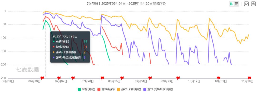 从市场反馈来看,沐瞳6月推出的《银与绯》表现相对亮眼。这款暗黑哥特风二次元RPG手游上线初期登顶iOS免费榜,畅销榜最高排第21位,但长线表现略显乏力。