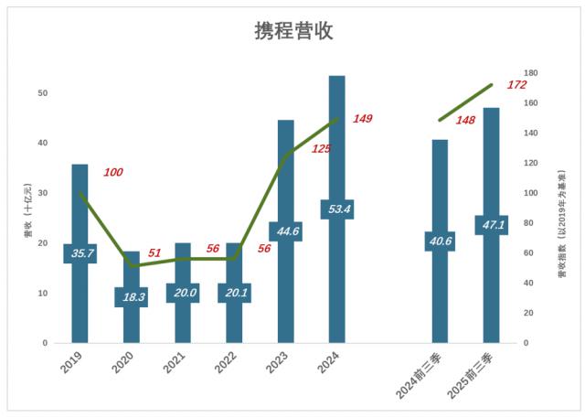 从2019年前三季度到2025年前三季度,携程营收年均复合增长率为9.5%,疫情造成的损失已基本追回。