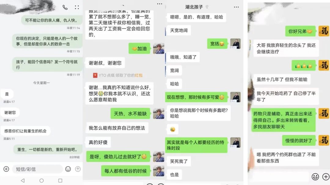 每个深夜,徐世海都会盯着屏幕,像探照灯一样扫过那些充斥着绝望、愤怒和迷茫的讯息,寻找可能指向生命终结的“信号”。他摸索出一套与孩子相处的方法:遇到孩子说“老子先走一步了”,他会回复“求捎带,我胆小”,顺势提出私聊后甚至“骂”起来——他认为在生死攸关时激起孩子的愤怒,或许能冲淡求死的欲望。对于“去意已决”的孩子,他会求助当地警察,在最后时刻拦截轻生者。