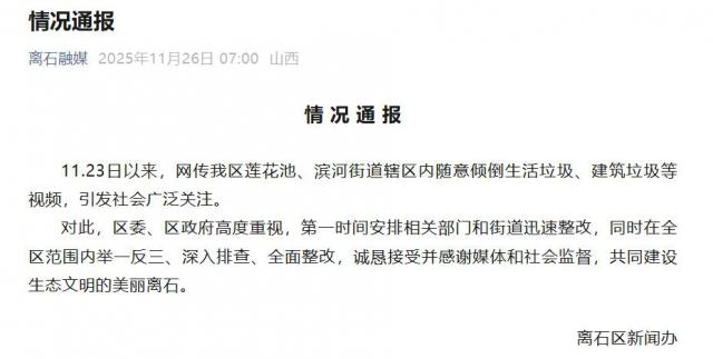 通报指出,11月23日起,网传离石区莲花池、滨河街道辖区内存在随意倾倒生活垃圾、建筑垃圾的视频,引发社会各界广泛关注。