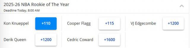 在最新的最佳新秀赔率中,克努佩尔(+110)位列第一,将状元弗拉格(+115)甩在身后。排名第三到第五的分别是探花秀埃奇库姆、13号秀奎因以及11号秀考沃德。本赛季截至目前,克努佩尔的表现十分亮眼,他共出战17场比赛,场均能贡献19.4分、5.8个篮板和2.9次助攻,投篮命中率为49.1%,三分命中率达43.8%,罚球命中率更是高达90%。