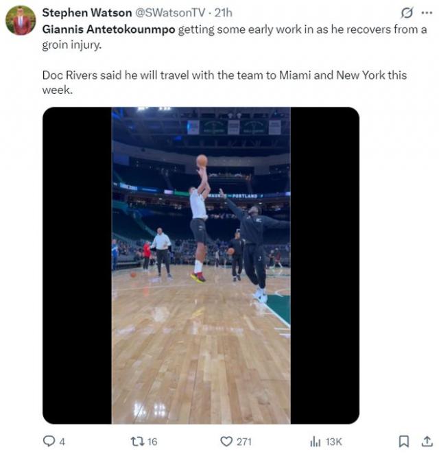 据道格-里夫斯透露,扬尼斯在腹股沟受伤初期就已开始日常恢复训练,接下来雄鹿的客场之旅(对阵热火、尼克斯)他也会随队。Shams此前报道称,扬尼斯的伤势为腹股沟一级拉伤,恢复时间预计1-2周。