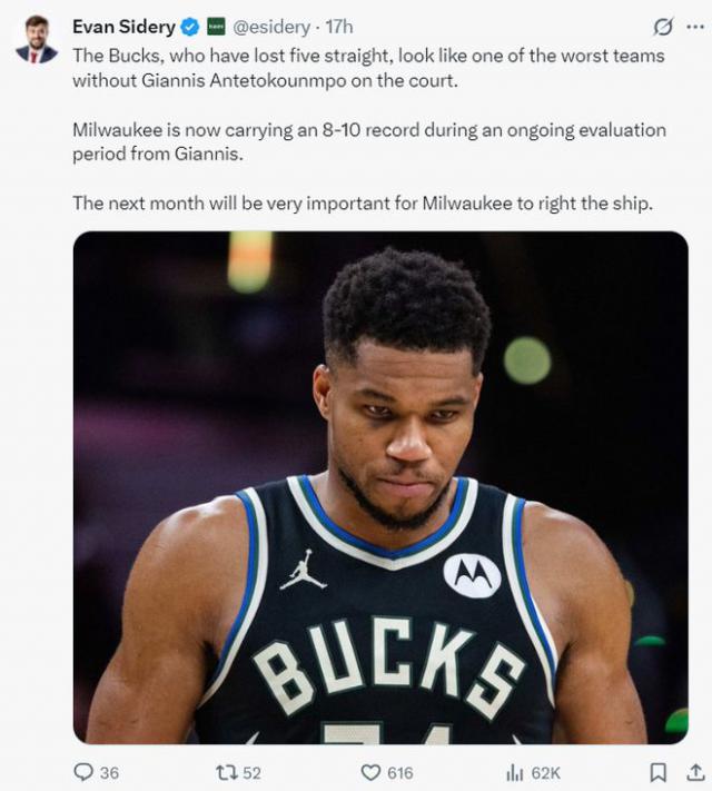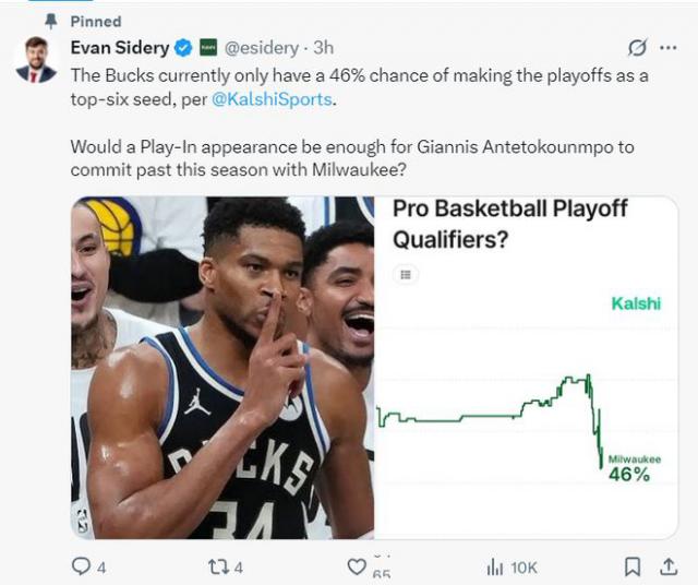 北京时间11月26日凌晨,埃文-斯迪瑞再次发文称,据KalshiSports的数据显示,排名东部第九的雄鹿直接进入东部前六(无需打附加赛)的概率仅为46%。若扬尼斯在季后赛中仅登场一次,这是否足以让他决定留守密尔沃基呢?