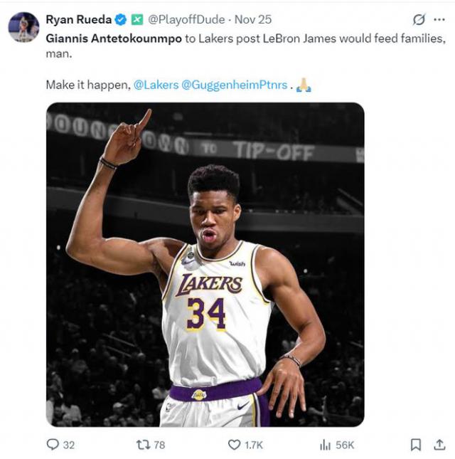湖人记者Ryan Rueda已开始畅想扬尼斯未来离队的场景,他写道:“扬尼斯加盟湖人后,能完美接替勒布朗-詹姆斯的位置,帮助球队度过诸多难关。伙计们,让这一切成真吧。”