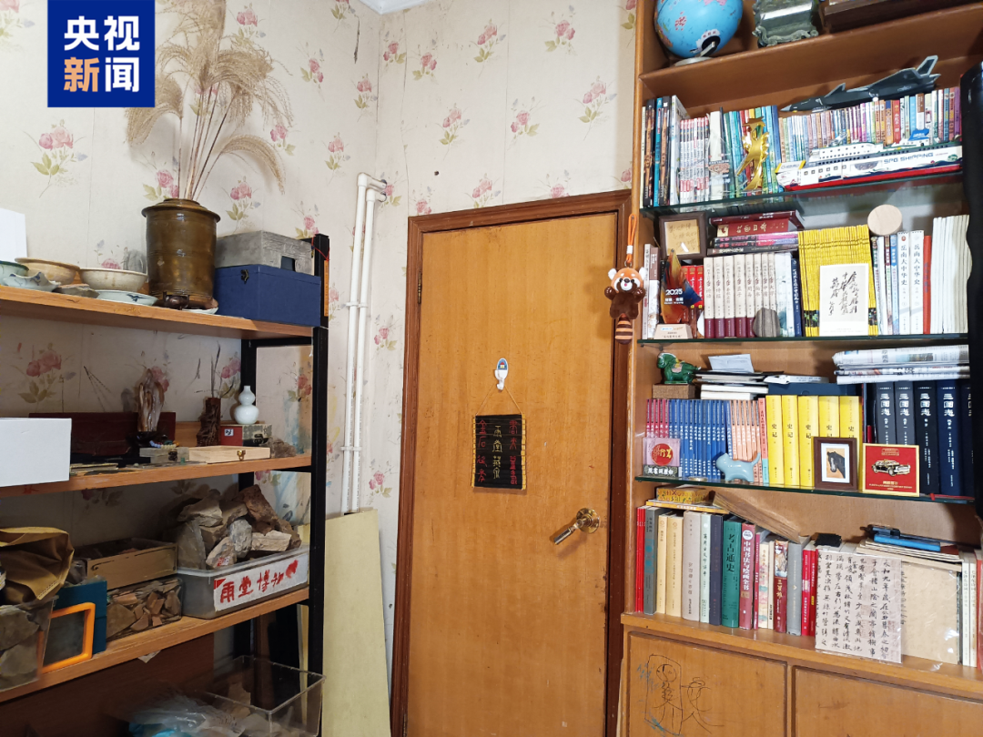 不大的卧室空间里,摆满了他收藏的旧书籍、铜钱、陶器、瓷器等物件,卧室门外还贴着他亲笔写的“雨堂博物馆”门牌。