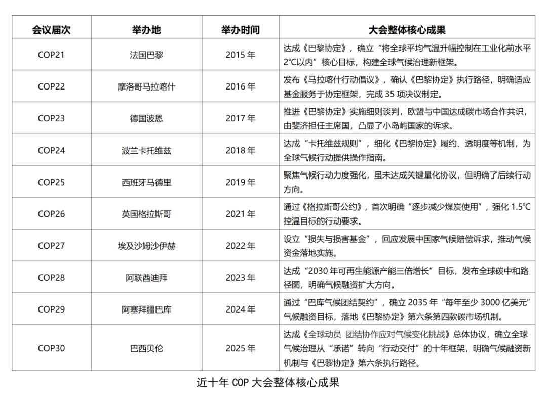 COP即“《联合国气候变化框架公约》缔约方大会”,是全球气候治理的最高决策机构,由198个国家和地区缔约方组成,每年举办一次并轮流在不同国家主办。其核心职能包括制定全球气候治理规则、设定减排与适应目标、协调资金技术支持、审议气候行动进展,推动全球共同应对气候变化。自1995年首届COP1以来,逐步形成“目标设定—规则制定—成果落地—进展盘点”的完整工作机制,《巴黎协定》《格拉斯哥气候公约》《巴库气候团结契约》等均为大会核心成果文件。随着大会从“减排目标设定”向“转型路径实施”深化,矿业的角色也从COP21的“隐性支撑”,经COP25的“价值明确”,到COP28、COP29、COP30的“治理纳入”,成为衔接能源转型、公正发展与生态保护的核心枢纽产业。