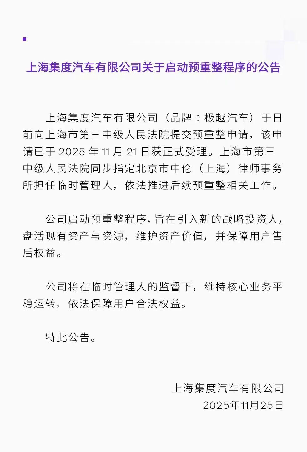 11月25日,极越微信公众号发布预重整公告,称已向上海市第三中级人民法院提交预重整申请,且于11月21日获正式受理。极越表示,启动预重整是为引入新战略投资人,盘活现有资产资源,维护资产价值,保障用户售后权益。