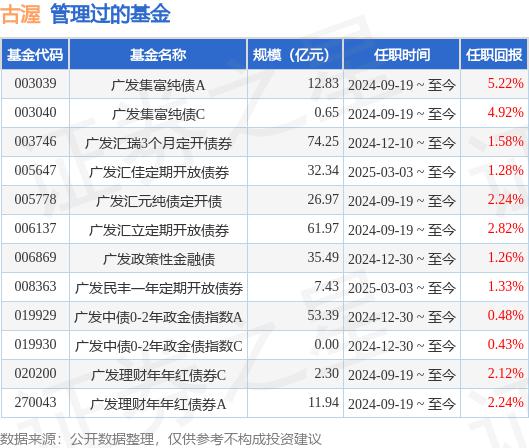 古渥先生为中国国籍,拥有金融学硕士学位。其职业经历丰富,2016年7月至2019年6月期间,就职于大成基金管理有限公司交易管理部,担任债券交易员一职;2019年6月至2022年3月,转至博远基金管理有限公司集中交易室,出任交易主管。2022年4月1日,古渥加入广发基金管理有限公司,先后在固定收益交易部担任债券交易员、固定收益交易部总经理助理并兼任利率交易组组长,之后又担任特定策略投资部策略研究员,目前的职务是特定策略投资部基金经理助理。在基金管理方面,古渥自2024年9月12日起,担任广发聚源债券型证券投资基金(LOF)、广发中债7-10年期国开行债券指数证券投资基金、广发中债0-2年政策性金融债指数证券投资基金的基金经理助理;2024年9月19日起,开始担任广发理财年年红债券型证券投资基金、广发汇元纯债定期开放债券型发起式证券投资基金、广发集富纯债债券型证券投资基金、广发汇立定期开放债券型发起式证券投资基金的基金经理;2024年12月10日,出任广发汇瑞3个月定期开放债券型发起式证券投资基金基金经理;2024年12月30日,担任广发政策性金融债债券型证券投资基金、广发中债0-2年政策性金融债指数证券投资基金基金经理;2025年3月3日,担任广发汇佳定期开放债券型发起式证券投资基金、广发民丰一年定期开放债券型发起式证券投资基金基金经理;2025年8月6日起,担任广发景秀纯债债券型证券投资基金基金经理。