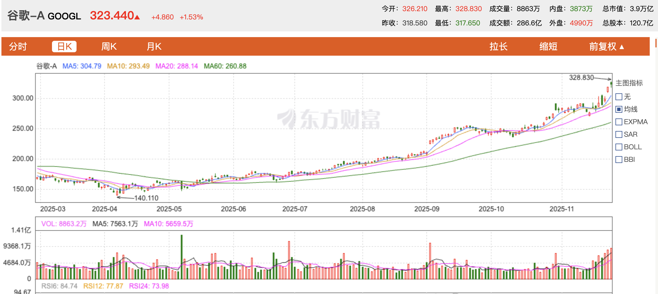 “一觉醒来,谷歌股价已突破320美元。”一位AI行业从业者感叹道。近一周,谷歌市值多次创下历史新高,11月26日,谷歌股价再次上涨超1.5%,收于323.4美元/股,市值突破3.9万亿美元,目前在美股市值排名中位居第三。近一个月,谷歌股价涨幅已超20%。