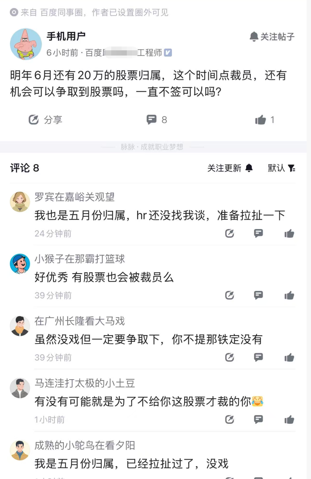 一位百度工程师还表达了对明年6月即将归属的20万股票的担忧。