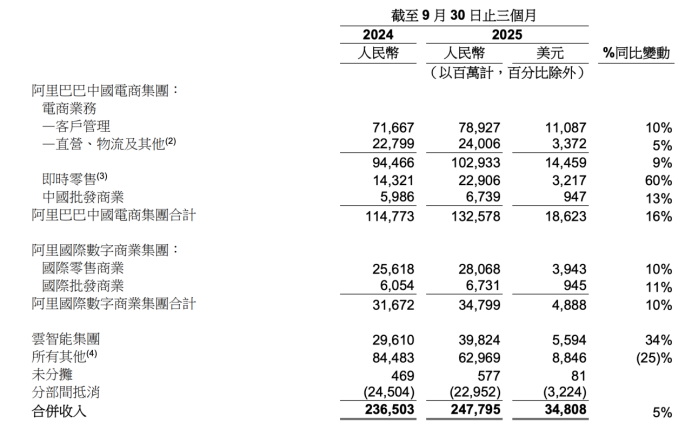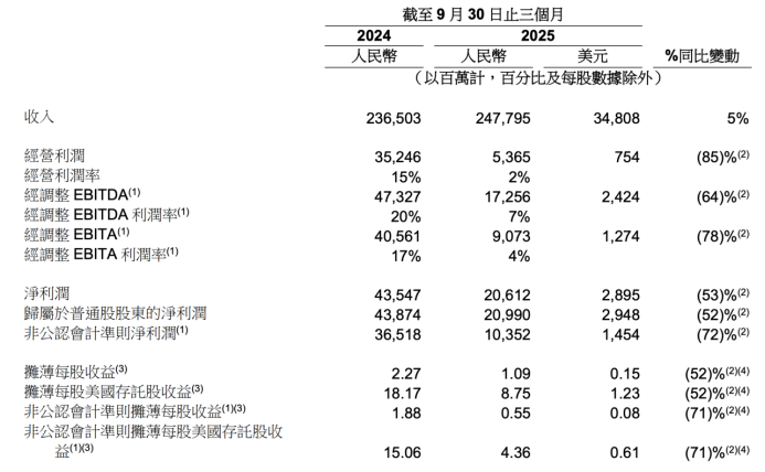 2025年11月25日,阿里巴巴发布2026财年第二季度(截至2025年9月底)财报:总营收2477.95亿元,同比增长5%,若剔除已出售业务影响则同比增长15%;净利润206.12亿元,同比下降53%。