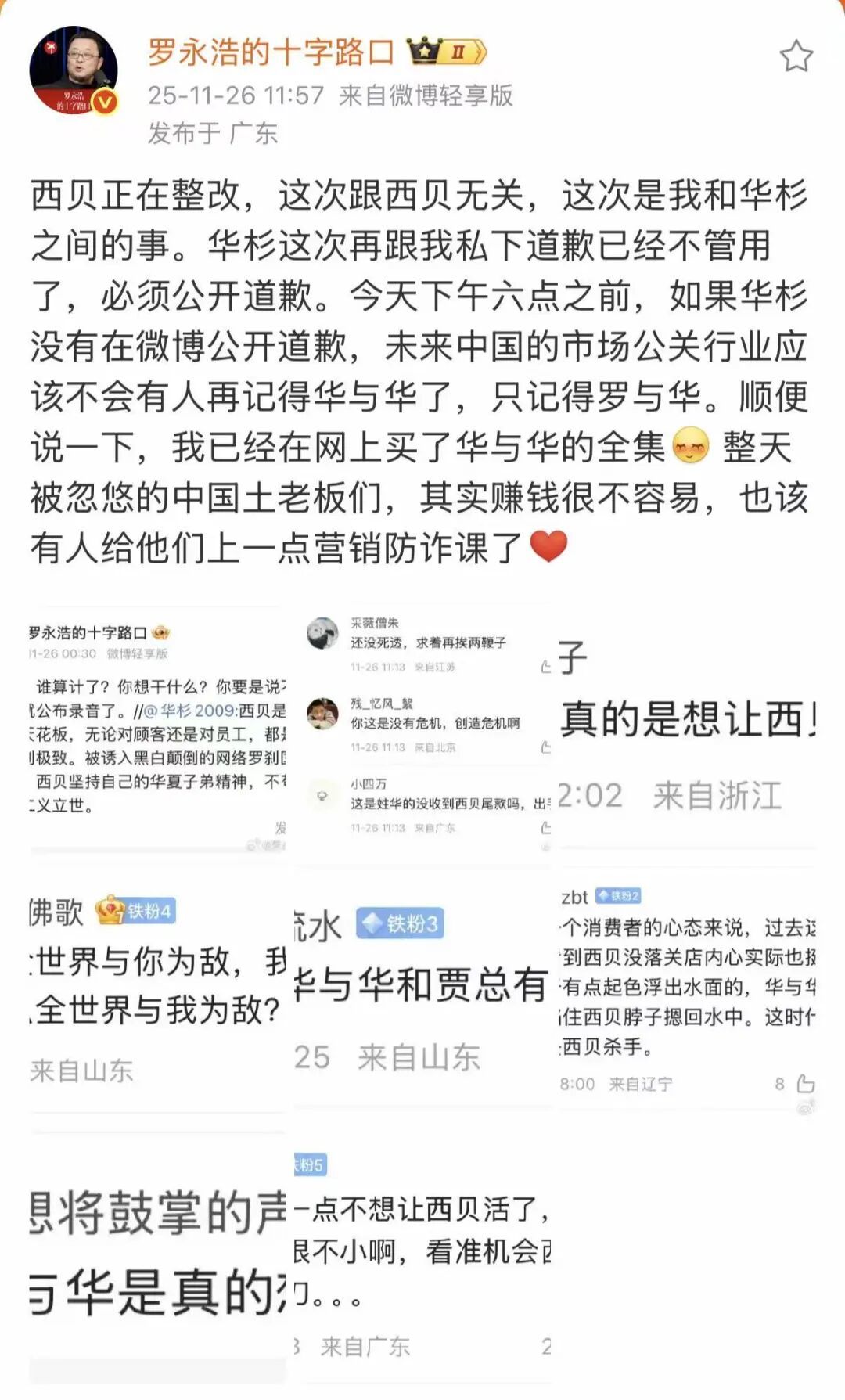 他指出西贝正在进行整改,此次事件与西贝无关,是他和华杉之间的纠葛。罗永浩还强调,若华杉在当日下午六点前未在微博公开道歉,未来中国市场公关行业或许没人会记得华与华,只知罗与华。