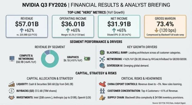 读取英伟达Q3财报PDF,提取营收、毛利率、同比增长、主要营收来源与风险提示,生成信息图:左侧展示营收趋势折线图,右侧罗列5条要点并配简图标,底部附一句话结论。