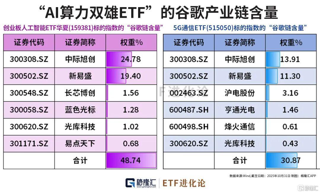 这或许正是创业板人工智能ETF华夏(159381)和5G通信ETF(515050)爆发的原因,两者的“谷歌链含量”分别达到48%和30.87%。
