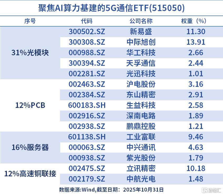 其中,5G通信ETF(515050)跟踪中证5G通信主题指数,深度聚焦5G通信(AI算力底座)产业链,涵盖31%光模块+12%PCB+16%服务器龙头+12%高速铜联接四大AI算力系统核心组件,权重股包括光模块双雄新易盛和中际旭创,也囊括工业富联等5G产业链龙头。